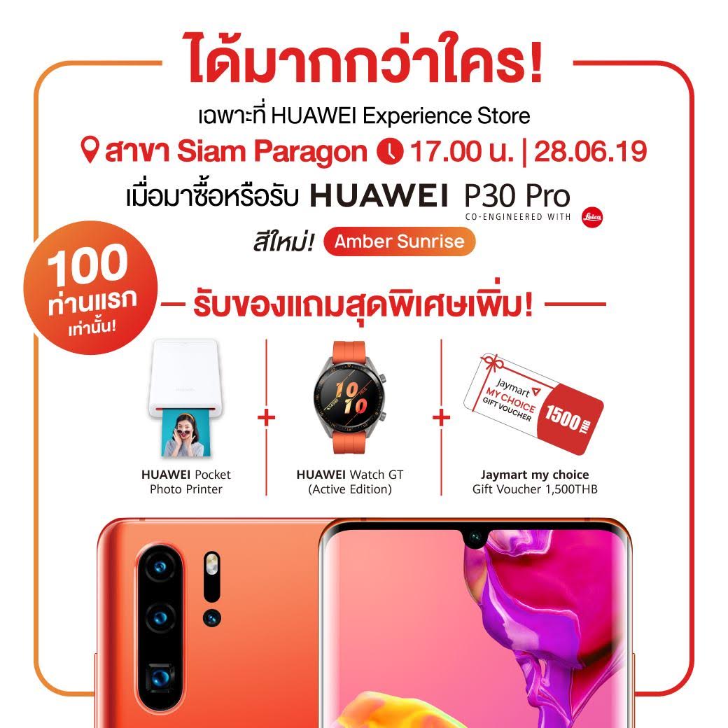 เพียง 100 ท่านแรกเท่านั้น (ทั้งผู้สั่งจองล่วงหน้าและวอล์คอินมาที่ร้านโดยไม่ได้สั่งจอง) ที่ชำระเงินซื้อ HUAWEI P30 Pro Limited Edition สี Amber Sunrise ณHuawei Experience Store สาขา Siam Paragon ในวันศุกร์ที่ 28 มิถุนายน 2562 เวลา 17.00 ไม่ต้องลุ้น! รับเลยทันที ของสมนาคุณสุดคุ้มมากมาย ได้แก่ HUAWEI Pocket Photo Printerมูลค่า 3,690 บาท, Watch GT Active Edition มูลค่า 5,990 THB และ Jaymart My Choiceมูลค่า 1,500 บาท