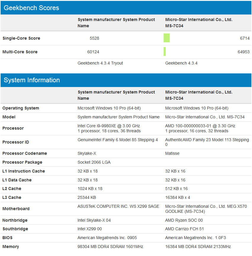 Ryzen 9 3950X จะมีความเร็ว 3.5GHz และสูงสุดที่ 4.7GHz แต่ผลทดสอบจาก Geekbench ที่ถูกแชร์ออกมา มีความเร็วถึง 5.2GHz ซึ่งอาจเป็นการทดสอบขีดจำกัดของ AMD ทำให้ได้โปรเซสเซอร์เดสก์ท็อปที่เร็วที่สุดเท่าที่เคยมีมา และมีประสิทธิภาพสูงกว่า Intel i9 9980XE 18 core (ตามรูปภาพเปรียบเทียบด้านล่าง)