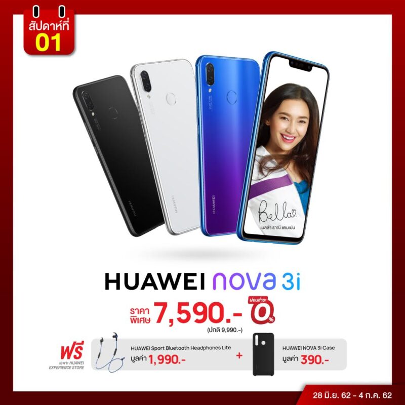 • HUAWEI nova 3i ปฏิวัติวงการเซลฟี่ ด้วยสมาร์ทโฟน 4 กล้องที่มาพร้อมระบบ AIอัจฉริยะ ในราคาพิเศษ 7,590 บาท พร้อมรับฟรี! HUAWEI Sport Bluetooth Headphones Lite มูลค่า 1,990 บาท และ HUAWEI nova 3i Case มูลค่า 390 บาท