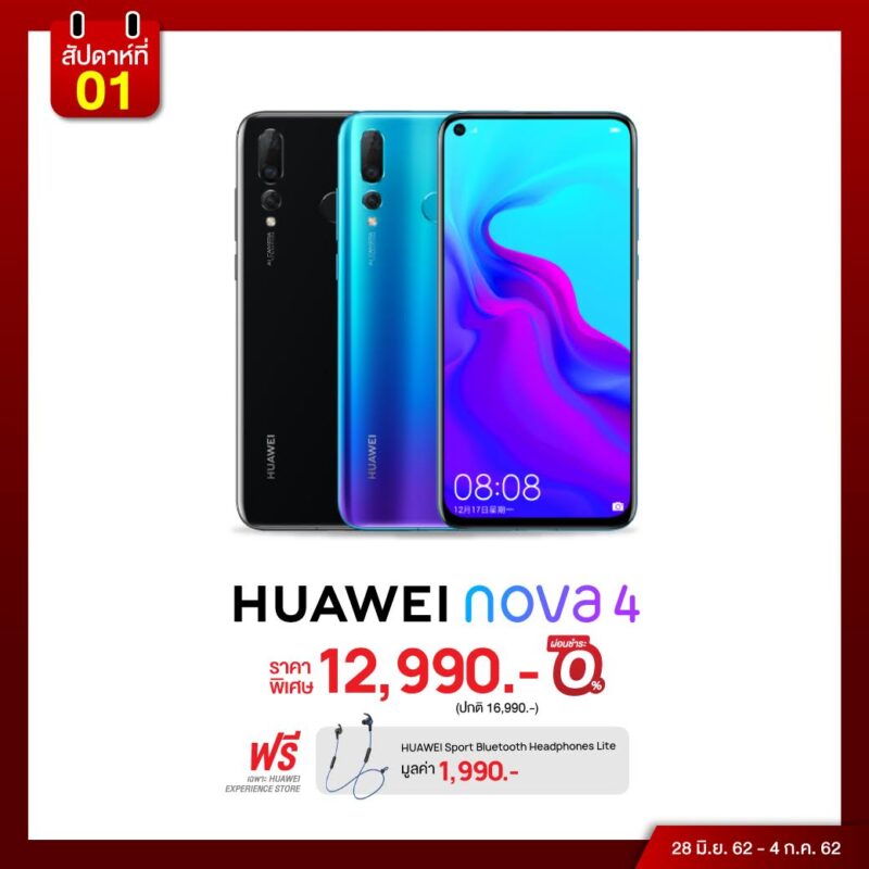 • HUAWEI nova 4 สมาร์ทโฟนเทรนด์ใหม่ สเปคแฟลกชิป ราคาโดนใจ เพียง 12,990บาท พร้อมรับฟรี! HUAWEI Sport Bluetooth Headphones Lite มูลค่า 1,990 บาท