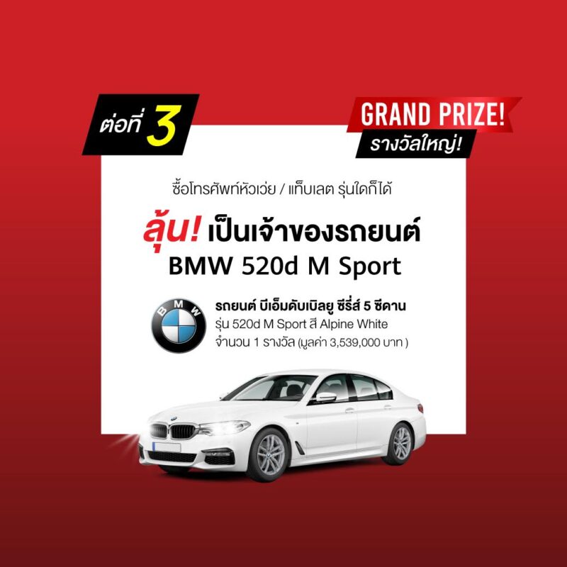 ก้าวข้ามขีดจำกัดความเซอร์ไพรส์ เพราะนอกจากสมาร์ทโฟน แท็บเล็ต และแก็ดเจ็ต ที่ขนทัพมาในราคาพิเศษแล้ว HUAWEI Grand Sales 2019 ยังชวนให้ลุ้นกันเต็มที่ เพียงซื้อสมาร์ทโฟนหรือแท็บเล็ตหัวเว่ย รุ่นใดก็ได้ ตั้งแต่วันที่ 28 มิถุนายน 2562 ถึงวันที่ 31สิงหาคม 2562 สามารถใช้หมายเลข IMEI1 ของสมาร์ทโฟนหรือแท็บเล็ตที่ซื้อ ลงทะเบียนเพื่อรับสิทธิ์ลุ้นรางวัลใหญ่ เป็นเจ้าของสุดยอดยนตรกรรมระดับเรือธงที่ใครๆ ต่างใฝ่ฝัน อย่าง “BMW 520d M sport” รถยนต์คันหรู รุ่นใหม่ล่าสุด มูลค่ากว่า 3.5 ล้านบาท 1รางวัล