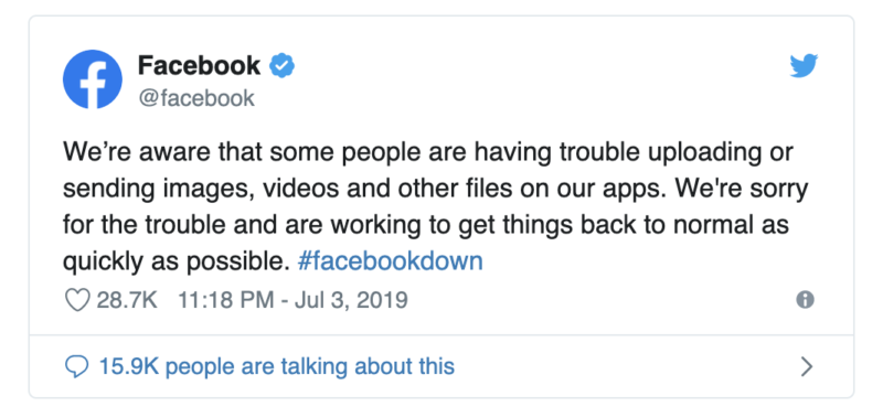 ซึ่งล่าสุดเช้าวันนี้เวลาประมาณ 7:00 น.ทาง Facebook และ Instargrm ได้ออกมาประกาศว่าได้แก้ไขปัญหาดังกล่าวเรียบร้อยแล้วผ่านทางบัญชีทางการที่ Twitter