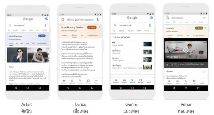 สำหรับฟีเจอร์แรกคือ ฟีเจอร์ค้นหาเนื้อเพลง โดย Google ได้ปรับปรุงการแสดงผลการค้นหาในส่วนของแท็บความรู้ หรือ Knowledge Panel ให้แสดงข้อมูลที่เกี่ยวข้องกับเพลงที่คนไทยค้นหากันบ่อยๆ นั่นก็คือ เนื้อเพลง เมื่อผู้ใช้ค้นหาเนื้อเพลงบน Google เช่น เนื้อเพลง Good Morning Teacher เนื้อเพลงจะปรากฎใน Knowledge Panel ทันที