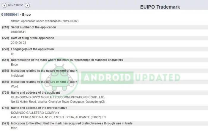 Enco ถูกจดเครื่องหมายการค้ากับสำนักงานทรัพย์สินทางปัญญาของสหภาพยุโรป (EUIPO – European Union Intellectual Property Office) เมื่อวันที่ 28 มิถุนายน 2019 เพื่อเตรียมไว้สำหรับเรียกชื่อสมาร์ทโฟนรุ่นใหม่ที่จะออกมาในอนาคต