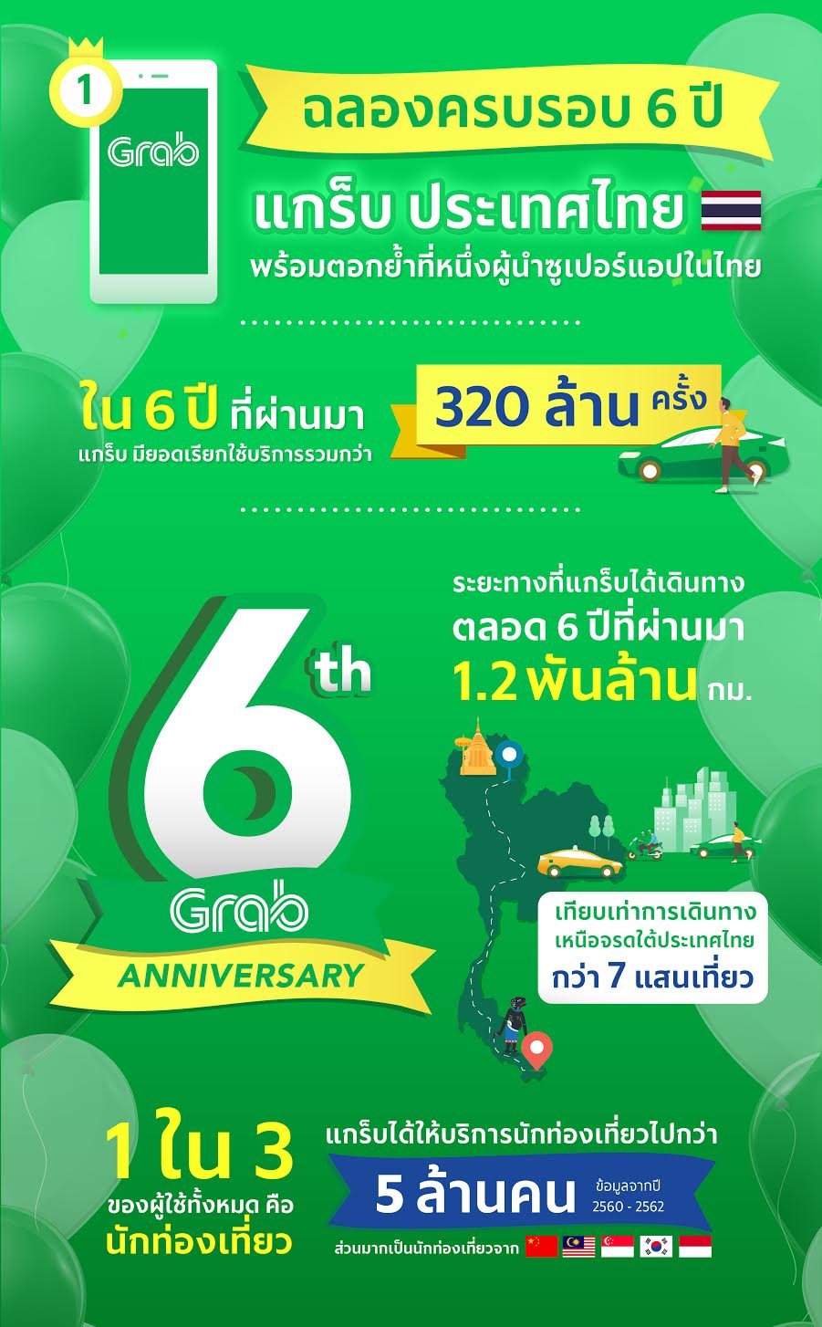 แกร็บ ผู้นำซูเปอร์แอปในภูมิภาคตะวันออกเฉียงใต้ ฉลองครบรอบ 6 ปี ในประเทศไทยในการร่วมสร้างความแข็งแกร่งให้เศรษฐกิจไทยรวมถึงการพัฒนาสังคม ด้วยความสำเร็จของความต้องการเรียกใช้บริการการเดินทาง การส่งอาหารและการส่งของรวมกว่า 320 ล้านครั้ง ที่เชื่อมต่อผู้บริโภคใน 16 จังหวัด 18 เมือง โดยพาร์ทเนอร์ผู้ขับขี่จำนวนหลายแสนคนสามารถสร้างรายได้ที่มากกว่าค่าแรงขั้นต่ำ ซึ่งแต่ละคนต่างทำงานกันอย่างทุ่มเท เพื่อยกระดับคุณภาพชีวิตรวมถึงขับเคลื่อนการเติบโตของเศรษฐกิจไทย เนื่องมาจากความนิยมในธุรกิจเรียกรถ บริการส่งอาหารและพัสดุออนดีมานด์ผ่านแอป รวมถึงความต้องการที่เพิ่มขึ้นของผู้บริโภค นอกจากนี้ พาร์ทเนอร์ร้านอาหารของแกร็บตั้งแต่สตรีทฟู้ดจนถึงร้านอาหารที่มีสาขาเป็นจำนวนมากต่างมียอดขายเพิ่มขึ้นอย่างเห็นได้ชัดจากการเพิ่มช่องทางการขายแบบดิจิทัลผ่านแกร็บฟู้ด