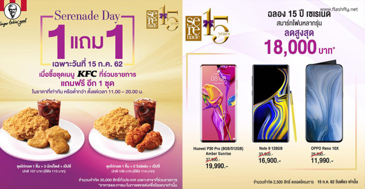 AIS เดินหน้าSerenade Day ทุกวันที่ 15 ของเดือนชวนลูกค้าเอไอเอส เซเรเนด ร่วมเฉลิมฉลองในโอกาสครบรอบ 15 ปีเซเรเนดสุดยิ่งใหญ่ต่อเนื่องครั้งที่ 2 เอาใจแฟนพันธุ์แท้ไก่ทอด KFC ทุกเพศทุกวัย โดยลูกค้าเอไอเอส เซเรเนด เลือกรับสิทธิ์ ซื้อ 1แถม 1 เมื่อซื้อเมนู KFC จาก 2 ชุด ที่ร่วมรายการ ได้แก่
