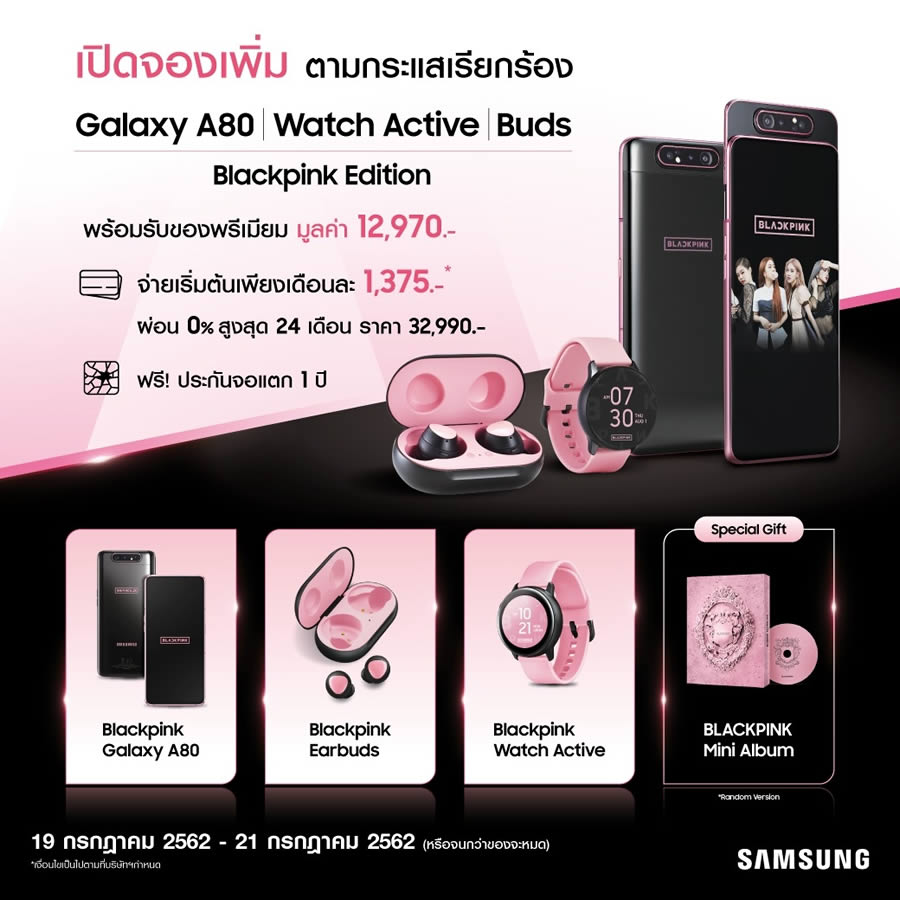 Samsung Galaxy A80 Blackpink Edition เปิดให้จองในราคาพิเศษ 32,990 บาท สามารถผ่อนชำระ 0% ได้นานสูงสุดถึง 24 เดือน สามารถจองได้ตั้งแต่วันที่ 19 – 21 กรกฎาคม 2562 นี้ ที่ซัมซุงออนไลน์ช็อป www.samsung.com/th/galaxy-a80-special และ Samsung Brand Shop ที่ร่วมรายการ