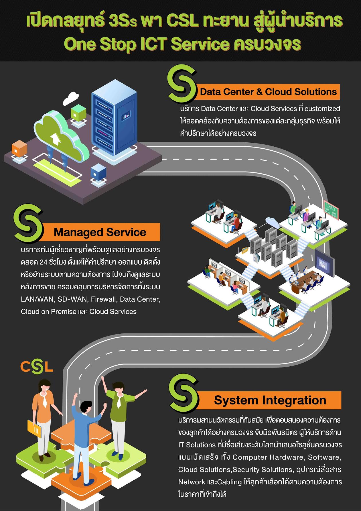 2.      S-Managed Service บริการทีมงานผู้เชี่ยวชาญที่พร้อมดูแลอย่างครบวงจร ตลอด 24 ชั่วโมง ด้วยประสบการณ์การให้บริการกับองค์กรชั้นนำในหลากหลายอุตสาหกรรมสำคัญ จึงสามารถให้คำปรึกษา ออกแบบ ติดตั้ง หรือย้ายระบบตามความต้องการของลูกค้าได้อย่างมีประสิทธิภาพ พร้อมดูแลระบบให้หลังการขาย ครอบคลุมการบริหารจัดการทั้งระบบ LAN/WAN, SD-WAN, Firewall, Data Center, Cloud On-Premise และ Cloud Services