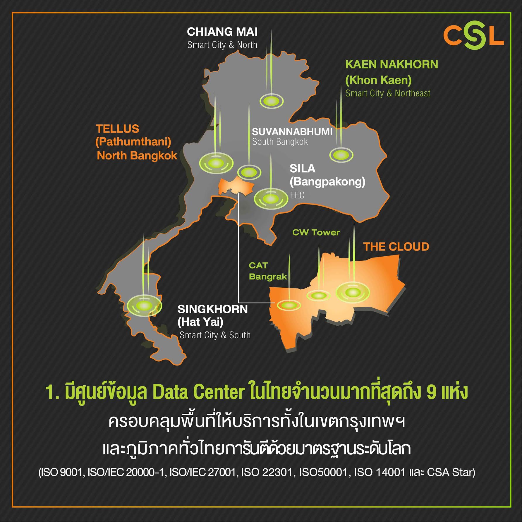 เป็นผู้ให้บริการที่มี Data Center ในไทยจำนวนมากที่สุด (The Most Multi-Locations Data Centers across Thailand) รวม 9 แห่งทั่วประเทศ ครอบคลุมพื้นที่ให้บริการทั้งในเขตกรุงเทพฯ และปริมณฑล  พร้อมขยายบริการออกไปสู่ภูมิภาค ได้รับการการันตีมาตรฐานการบริการระดับสากล ISO 9001, ISO/IEC 20000-1, ISO/IEC 27001, ISO 22301, ISO 50001, ISO 14001 และ CSA Star