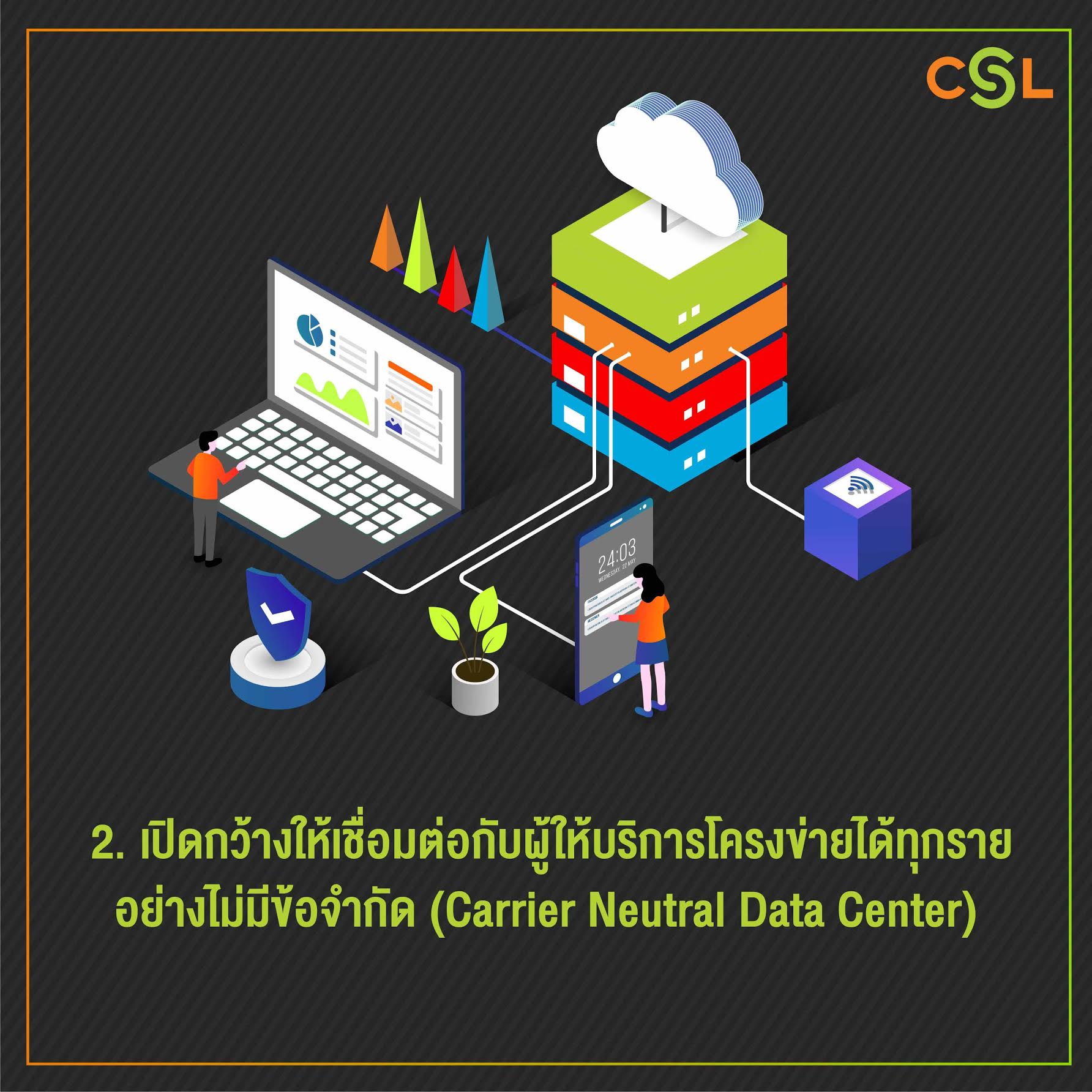 “จากความแข็งแกร่งที่เรามี เมื่อรวมกับการที่ CSL ได้เข้ามาเป็นหนึ่งในกลุ่มเอไอเอสซึ่งมีความแข็งแกร่งด้าน Digital Infrastructures ที่ทรงประสิทธิภาพเป็นอันดับ 1 ของประเทศ ได้แก่ เครือข่าย Mobile ในฐานะผู้ให้บริการที่มีคลื่นความถี่มากที่สุดในประเทศ, อีกทั้งยังเป็นเจ้าของโครงข่าย Fiber Optic ความยาวมากกว่า 160,000 ก.ม.ทั่วประเทศ  พร้อมให้บริการอินเทอร์เน็ตบรอดแบนด์ความเร็วสูงที่ใช้เทคโนโลยีไฟเบอร์ออพติกแท้รายแรกของไทย จึงพร้อมตอบสนองการใช้งานของธุรกิจทุกภูมิภาคทั่วไทย ทั้งการรับส่งข้อมูลระหว่างสาขาภายในประเทศและการส่งข้อมูลระหว่างประเทศ ด้วยแบนด์วิธในประเทศ (NIX) ที่ใหญ่ที่สุดในไทย รองรับการใช้งานในประเทศถึง 2.9 Tbps และแบนด์วิธระหว่างประเทศ (IIG) ขนาด 1.2 Tbps รวมถึงการที่เอไอเอสมีเครือข่าย IoT ทั้งโครงข่าย eMTC และ NB-IoT ที่ทรงประสิทธิภาพ ครอบคลุม 77 จังหวัดทั่วประเทศ เป็นรายแรกและรายเดียวในไทย
