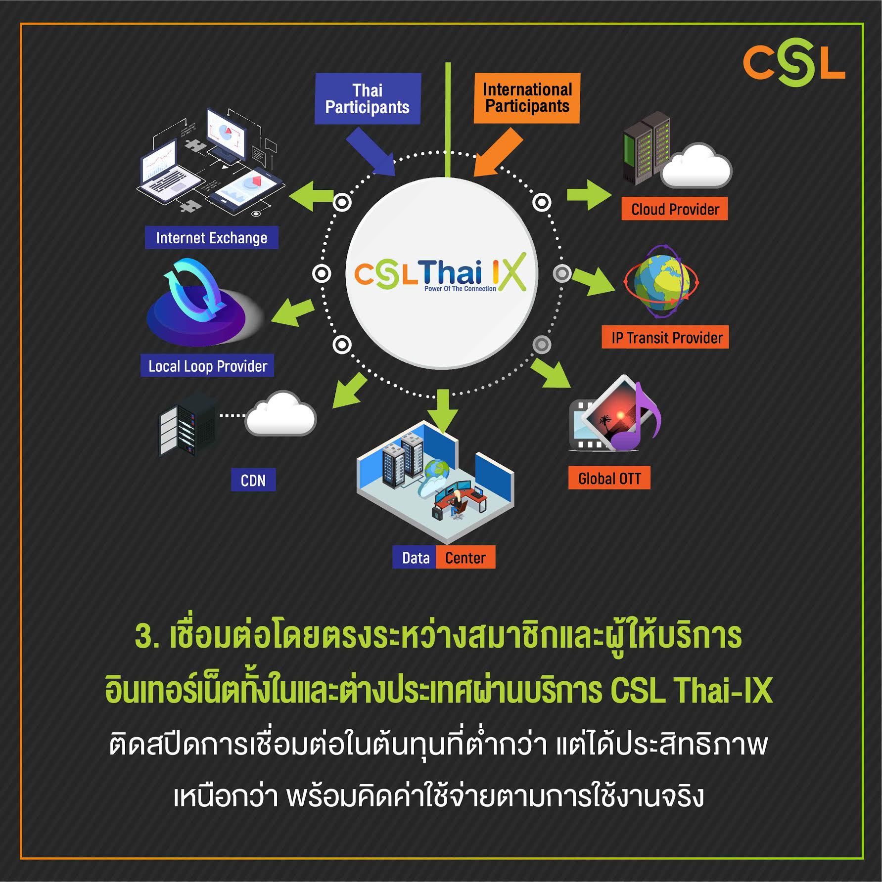 พร้อมเชื่อมต่อโดยตรงระหว่างสมาชิกและผู้ให้บริการอินเทอร์เน็ตทั้งในและต่างประเทศผ่านบริการ CSL Thai-IX ติดสปีดการเชื่อมต่อในต้นทุนที่ต่ำกว่า แต่ได้ประสิทธิภาพเหนือกว่า พร้อมคิดค่าใช้จ่ายตามการใช้งานจริง หมดกังวลเรื่องต้นทุนส่วนเกิน ตอบโจทย์ความต้องการของกลุ่มธุรกิจขนาดใหญ่ทั้งในและต่างประเทศ