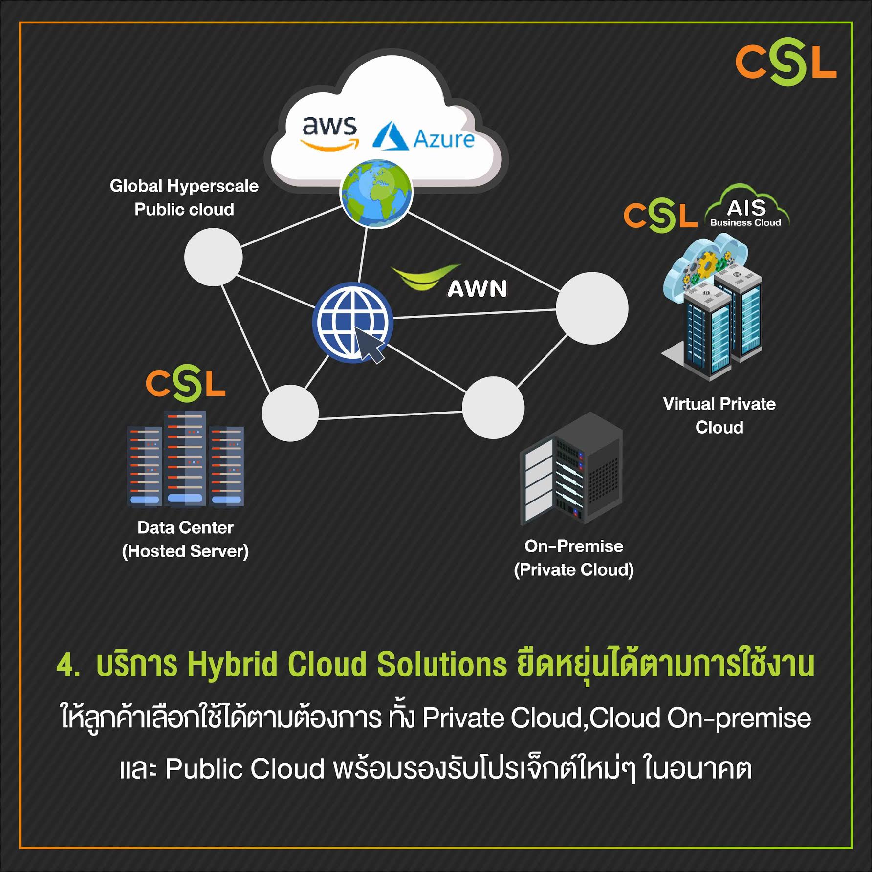 บริการ Hybrid Cloud Solutions รวมความสามารถของ Private Cloud, Cloud On-premise และ Public Cloud เข้าด้วยกัน จึงตอบสนองความต้องการของลูกค้าได้อย่างตรงจุดและสามารถยืดหยุ่นได้ตามการใช้งาน ภายใต้ความร่วมมือกับพันธมิตรผู้ให้บริการ Cloud ชั้นนำระดับโลก ทั้ง Microsoft Azure, VMware, AWSทำให้ต้นทุนต่ำลง และยังสามารถขยาย Capacity ได้ตามต้องการ เพื่อรองรับโปรเจ็กต์ใหม่ๆ ในอนาคต