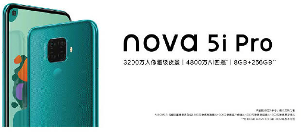 Huawei Nova 5i Pro มาพร้อมจอแสดงผล Full HD+ ขนาด 6.26 นิ้ว เจาะรูไว้ที่มุมบนสำหรับติดตั้งกล้องเซลฟี่ 32 ล้านพิกเซล ส่วนกล้องหลัง 4 ตัว ประกอบด้วย กล้องหลัก 48 ล้านพิกเซล รูรับแสง f/1.8 กล้องมุมกว้างพิเศษ 8 ล้านพิกเซล ส่วนกล้องอีก 2 ตัว มีความละเอียดเท่ากัน 2 ล้านพิกเซล