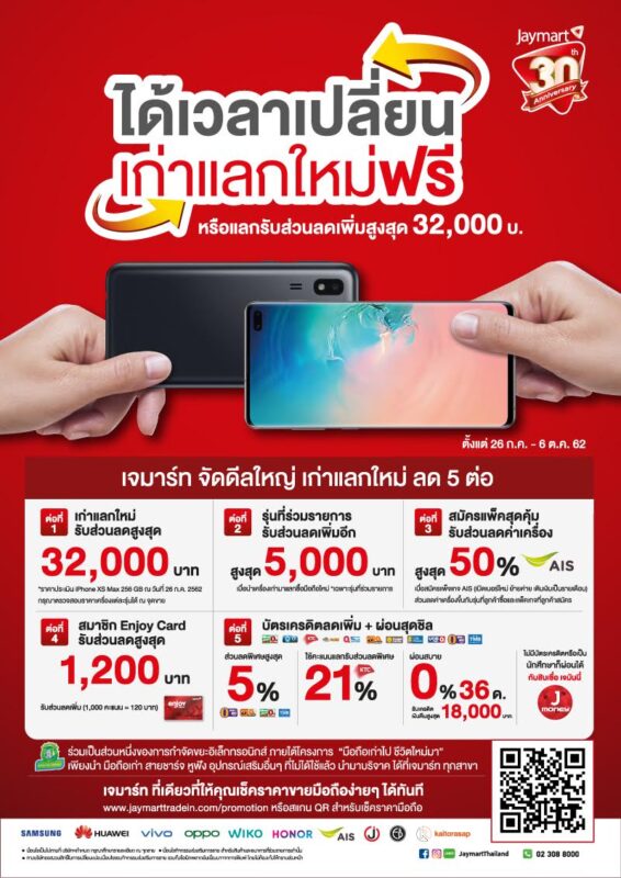 เมื่อลูกค้านำมือถือเครื่องเก่าที่ร่วมรายการมาแลกเครื่องใหม่ได้ฟรี หรือแลกรับส่วนลดเพิ่ม โดยลูกค้าสามารถเช็คราคาขายมือถือได้ง่ายๆ เพียงปลายนิ้วผ่าน www.jaymarttradein.com/promotion