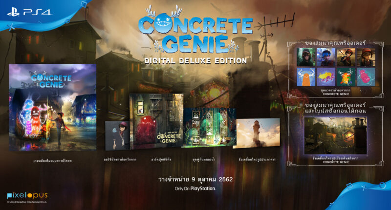 โซนี่ เอนเตอร์เทนเมนต์ สิงคโปร์ ประกาศวันวางจำหน่ายเกม “Concrete Genie” พร้อมรองรับภาษาไทย ในวันที่ 9 ตุลาคม ศกนี้ ราคาแบบแผ่นบลูเรย์ Standard Edition และดิจิทัล Standard Digital Edition ราคา 1,090 บาท และดิจิทัลดาวน์โหลด Digital Deluxe Edition ราคา 1,390 บาท