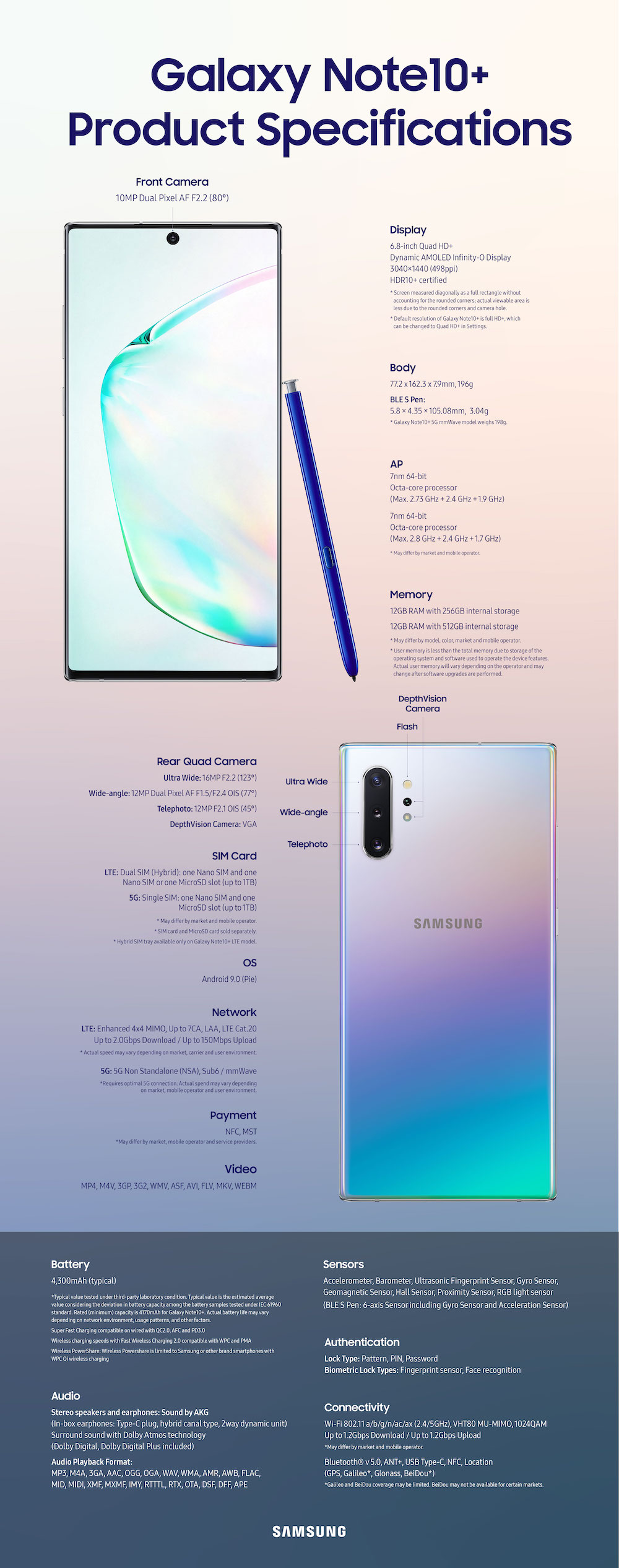Galaxy Note 10 ได้รับความจำ RAM 8GB จับคู่กับ ROM 256GB ส่วน Galaxy Note 10+ ได้รับความจำ RAM 12GB จับคู่กับ ROM 256GB และ 512GB