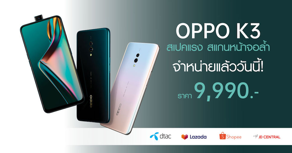 นับว่าเป็นสมาร์ทโฟนน้องใหม่มาแรงอีกรุ่นหนึ่งก็ว่าได้กับ OPPO K3 สมาร์ทโฟนรุ่นล่าสุดจากค่ายมือถือ OPPO ที่เปิดตัวมาด้วยสเปคที่เรียกได้ว่าถูกใจสายเกมเมอร์สุดๆ ไม่ว่าจะเป็น Snapdragon 710, RAM 8 GB และ ROM 128 GB ทำให้เล่นเกม ได้อย่างไหลลื่น ไม่กระตุก และเล่นได้อย่างต่อเนื่องด้วย VOOC Flash Charge 3.0 รวมถึงสามารถสแกนลายนิ้วมือได้เร็วกว่า แม่นยำกว่า ด้วย On Screen Fingerprint Unlock พร้อม Rising Camera กล้องหน้า 16MP ที่ซ่อนอยู่ใต้หน้าจอที่ทำให้ได้หน้าจอกว้างเต็มตา ไร้ติ่ง แบบ Panoramic Screen รวมถึงกล้องหลังแบบคู่ 16MP+2MP นอกจากนี้ OPPO K3 ได้นำสีสันจากธรรมชาติมาใช้ในการดีไซน์แบบไล่เฉดสีทั้ง Jade Black สีสันของน้ำทะเลลึก และ Pearl White สีเหลือบมุกยามพระอาทิตย์ขึ้น จนได้สมาร์ทโฟนที่มีดีไซน์โดดเด่นเป็นเอกลักษณ์