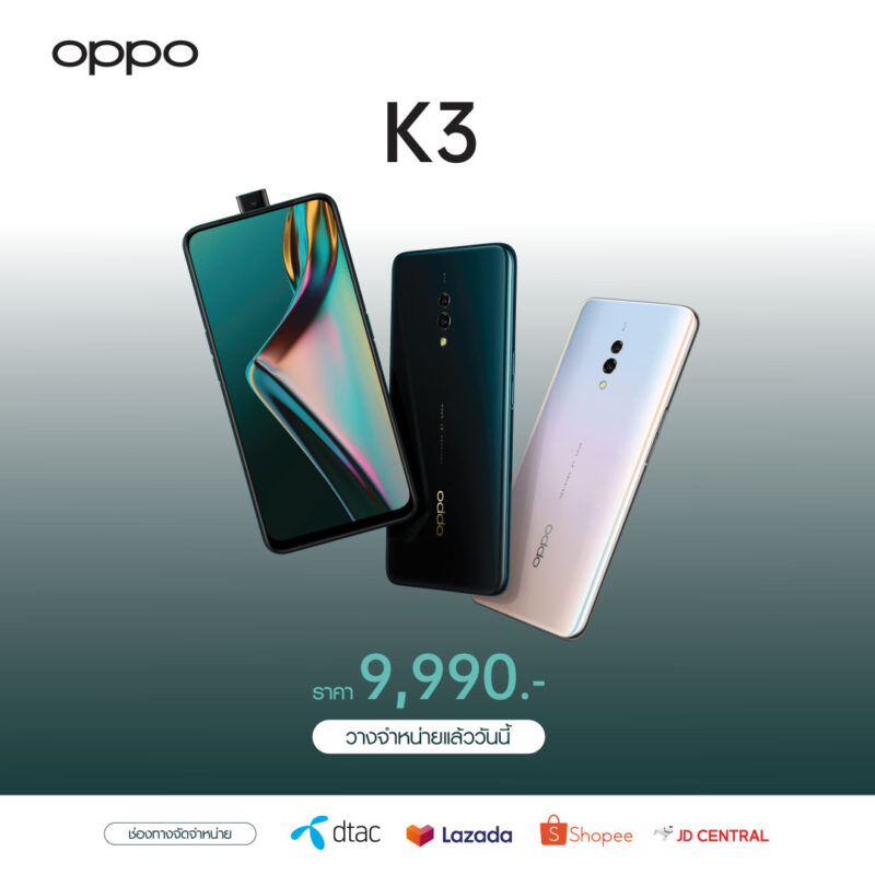 สำหรับใครที่สนใจอยากเป็นเจ้าของ OPPO K3 สามารถซื้อได้แล้ววันนี้ในราคาเพียง 9,990 บาทที่ Lazada, Shopee และ JD Central พร้อมซื้อ OPPO K3 ในราคาเริ่มต้นเพียง 7,990 บาท เมื่อซื้อกับศูนย์บริการเครือข่าย DTAC ได้ตั้งแต่วันนี้ หรือสามารถเป็นเจ้าของ OPPO K3 ได้ที่