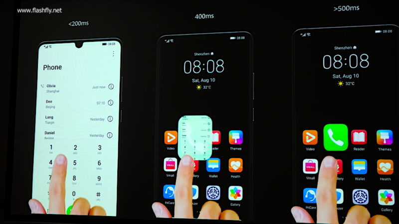 เบื้องหลังที่ทำให้ EMUI 10 ตอบสนองการสัมผัสได้อย่างรวดเร็ว มาจากการพยายามลดความหน่วงจากการสัมผัสให้มากที่สุด โดยจะตัดการแสดงภาพเคลื่อนไหวออกไป เมื่อมีการแตะหน้าจอและยกนิ้วขึ้นในช่วงเวลา 100 – 130 มิลลิวินาที