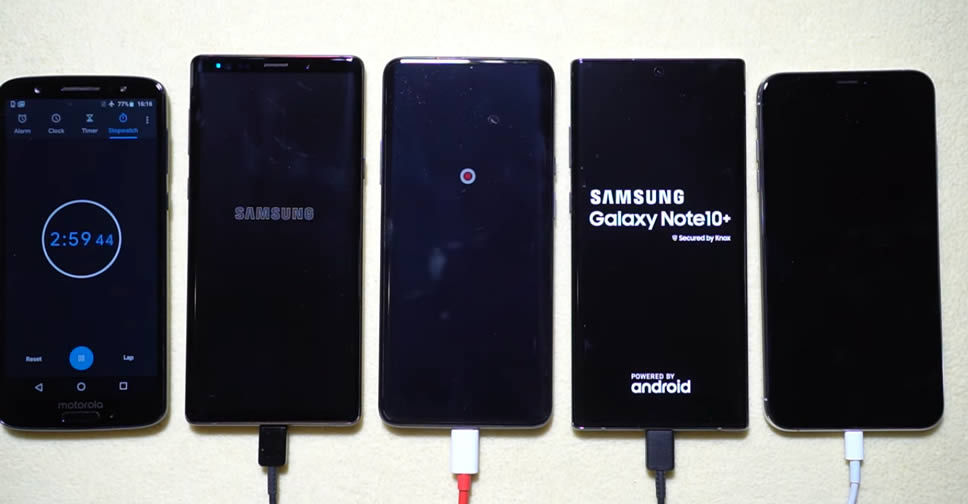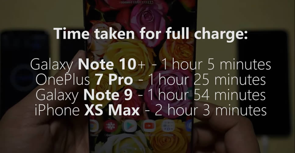 จากการทดสอบของ Gadgets Portal พบว่า Samsung Galaxy Note 10+ ชาร์จเร็วกว่า OnePlus 7 Pro ประมาณ 20 นาที ถึงแม้จะมีแบตเตอรี่ใหญ่กว่า โดย Galaxy Note 10+ จะชาร์จแบตเตอรี่ได้อย่างเต็มที่ 25W เมื่อแบตเตอรี่ค่อนข้างว่างเปล่า และจะลดเหลือ 15W เมื่อแบตเตอรี่ใกล้เต็ม แต่ OnePlus 7 Pro จะชาร์จเพียง 10W เมื่อแบตเตอรี่ใกล้เต็ม ทำให้การชาร์จแบตเตอรี่จาก 0 – 100% ทำได้ช้ากว่าเรือธงรุ่นใหม่ของ Samsung