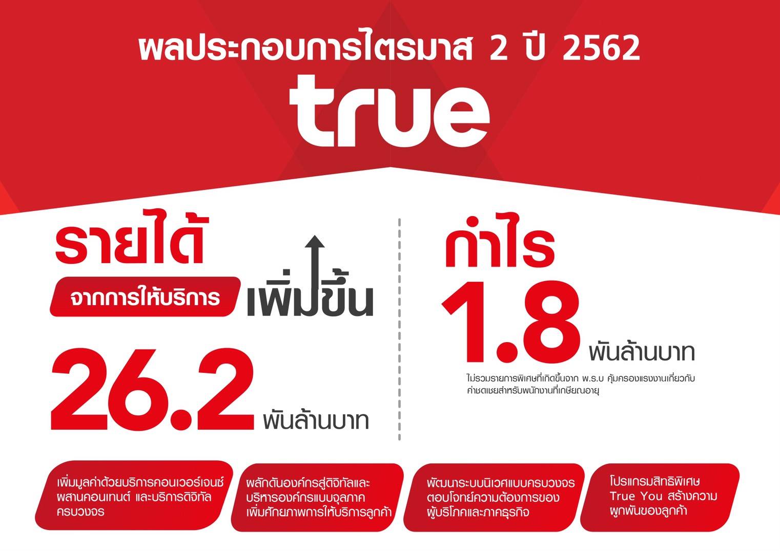 บมจ. ทรู คอร์ปอเรชั่น (SET: TRUE) – กลุ่มทรู รายงานผลการดำเนินงานที่ยังคงเติบโตและกำไรได้อย่างต่อเนื่อง โดยมีผลกำไร 1.8 พันล้านบาท หากไม่รวมรายการพิเศษที่เกิดขึ้นจากการแก้ไขพระราชบัญญัติคุ้มครองแรงงานเกี่ยวกับค่าชดเชยสำหรับพนักงานที่เกษียณอายุในไตรมาส 2 ปี 2562 ซึ่งกำไรที่เติบโตสูงขึ้นนี้เป็นผลมาจากรายได้จากการให้บริการที่เพิ่มขึ้นเป็น 26.2 พันล้านบาท หนุนโดยการเติบโตเหนืออุตสาหกรรมของรายได้จากการให้บริการของ ทรูมูฟ เอช ที่ร้อยละ 6.3 จากปีก่อน และมาตรการบริหารค่าใช้จ่ายที่ส่งผลบวกอย่างต่อเนื่อง บริษัทฯ เชื่อมั่นว่าจะสามารถเติบโตและรายงานกำไรในปี 2562 ได้ตามเป้าหมาย