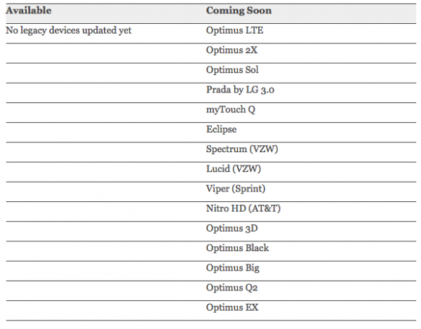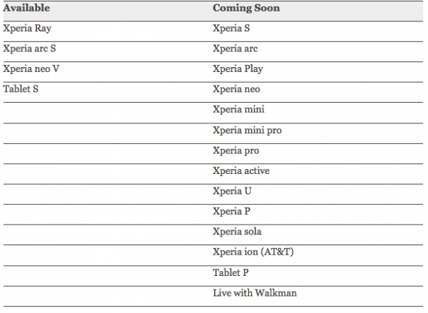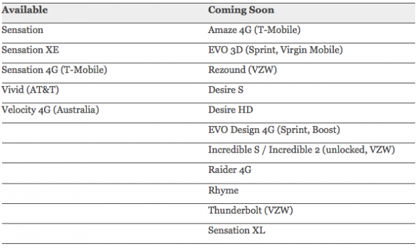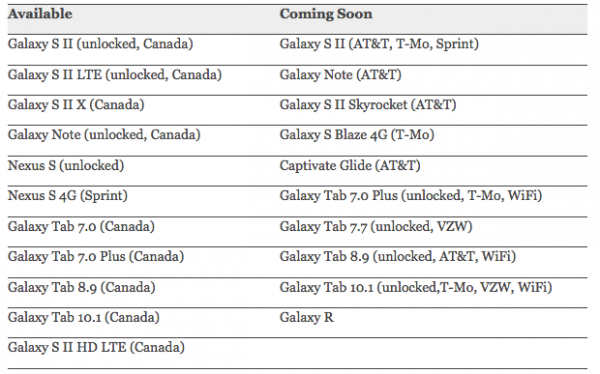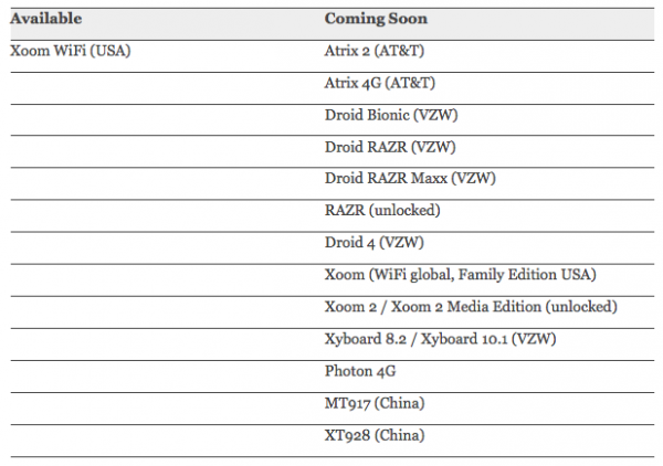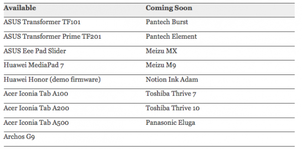 ข้อมูลดังกล่าวถูกรวบรวมและนำเสนอโดยเว็บไซต์ชื่อดัง engadget ซึ่งข้อมูลดังกล่าวได้แยกออกเป็นตามยี่ห้อของสมาร์ทโฟนและแท็ปเล็ตต่างๆที่มีการใช้ระบบปฎิบัิตการ Android อยู่ โดยจะแบ่งแยกออกเป็นรุ่นที่พร้อมจะอัพเดทในช่วงเดือนมิถุนายนในฝั่งของ Available และรุ่นที่จะทะยอยอัพเดทตามมาทีหลังในฝั่งของ Coming Soon