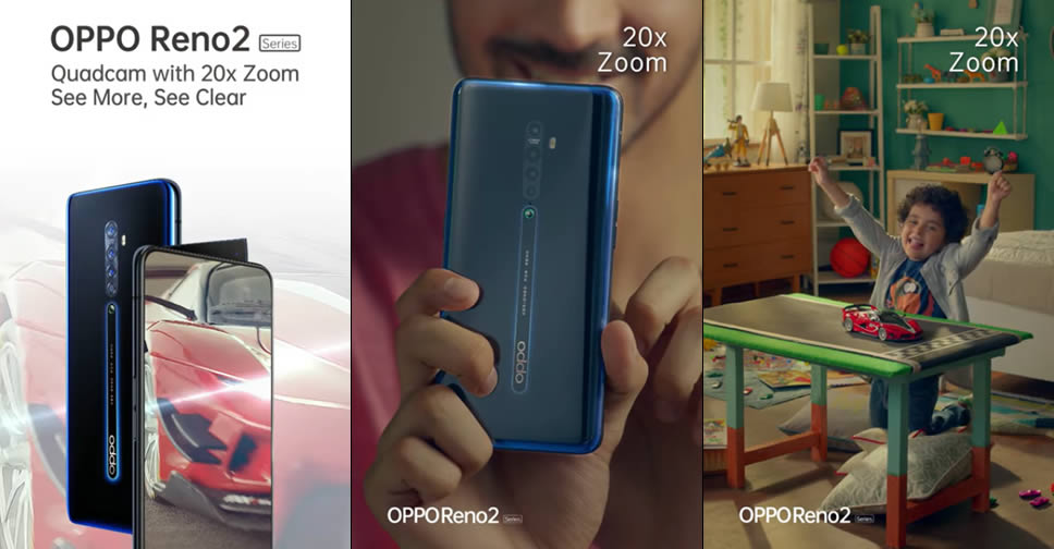 OPPO Mobile India ปล่อยวีดีโอออกมาโปรโมทสมาร์ทโฟน OPPO Reno 2 ผ่านช่องทาง YouTube โดยวีดีโอตัวแรก แสดงให้เห็นจุดเด่นของระบบลดภาพสั่นไหวในระหว่างถ่ายวีดีโอ และทีเซอร์อีกตัวของ Reno 2 ยืนยันว่ามาพร้อมเลนส์ซูม 20 เท่า และยังเผยให้เห็นดีไซน์ด้านหลังของสมาร์ทโฟนด้วย