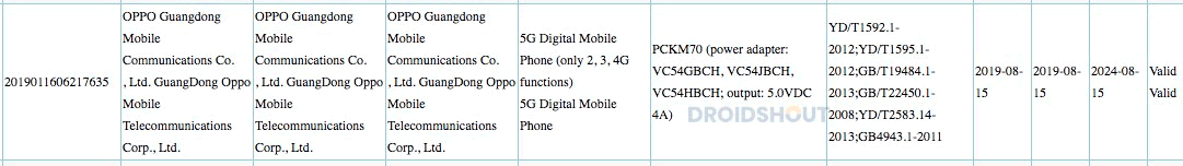 หน่วยงาน 3C (China Compulsory Certification) ได้ผ่านการรับรองให้กับสมาร์ทโฟน OPPO PCKM70 โดยระบุว่าสมาร์ทโฟนรุ่นนี้ รองรับเครือข่าย 5G และสนับสนุนเทคโนโลยีชาร์จเร็ว VOOC Flash Charge 3.0 (20 วัตต์) ซึ่งแหล่งข่าวเชื่อว่า PCKM70 จะใช้ชื่อ Reno 2 เมื่อได้รับการเปิดตัวทางการ