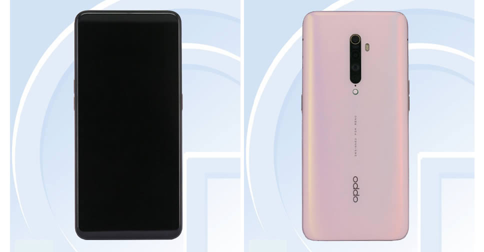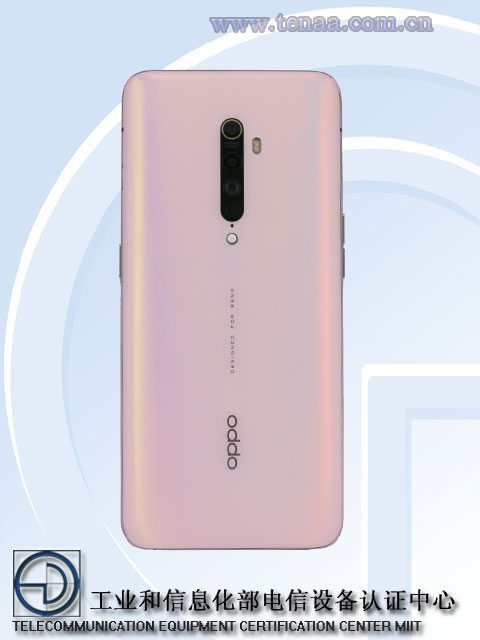 OPPO Reno 2 ที่ส่งมาให้ TENAA ตรวจสอบมาตรฐานมีด้วยกัน 2 รุ่น คือ PCKM00 กับ PCKT00 มาพร้อมจอแสดงผล AMOLED (2400 x 1080 พิกเซล) ขนาด 6.5 นิ้ว ทำงานบนพื้นฐาน Android 9.0 Pie ใช้ชิปประมวลผล 2.2GHz Octa Core (คาดว่าจะเป็น Qualcomm Snapdragon 730G) ความจำ RAM 8GB จับคู่กับ ROM 128GB หรือ 256GB กล้องหลัง 4 ตัว 48 + 13 + 8 + 2 ล้านพิกเซล กล้องเซลฟี่ 16 ล้านพิกเซล ความจุแบตเตอรี่ 3,915mAh ขนาดบอดี้ 160 x 74.3 x 9.5 มิลลิเมตร น้ำหนัก 189 กรัม