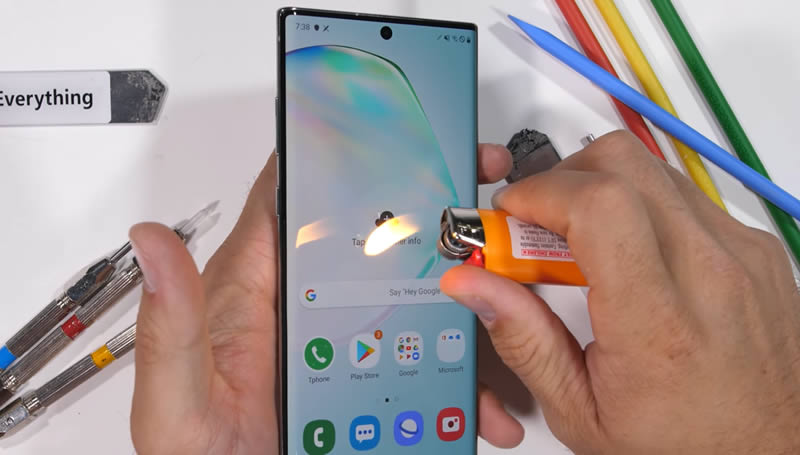 จอแสดงผลของ Samsung Galaxy Note 10+ ยังถูกเผาด้วยไฟแช็กนานประมาณ 20 วินาที จนเกิดรอยด่าง แต่พอหายร้อน รอยด่างก็หายไปจนหมด