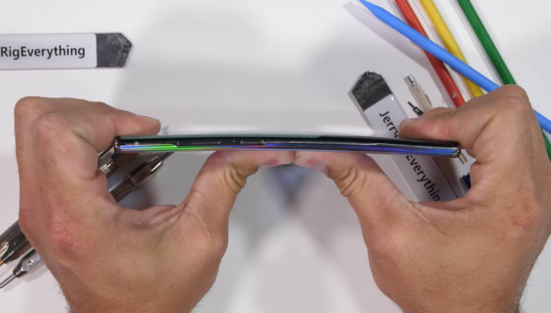 บอดี้ของ Samsung Galaxy Note 10+ ถูกครอบทับด้วยกระจกทั้งด้านหน้าและด้านหลัง ทำให้ป้องกันรอยขีดข่วนของใบมีดคมๆ ได้เป็นอย่างดี ยกเว้นส่วนขอบที่เป็นโลหะ นอกจากนี้ บอดี้ยังมีความแข็งแรงสูงมาก แม้ Zack Nelson จะพยายามออกแรงดัดให้โค้งงอ ก็แทบไม่ได้รับความเสียหาย