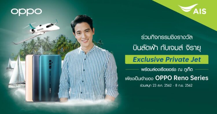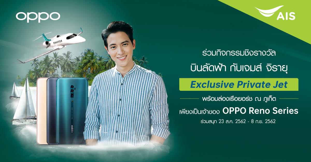 เพียงเขียนความประทับใจที่มีต่อ OPPO Reno Series เมื่อใช้เครือข่าย AIS ผ่านทาง AIS Facebook และกดแชร์ link เป็นสาธารณะ (Public) ก็สามารถบินลัดฟ้าพร้อมล่องเรือยอร์ช ไปกับเจมส์ จิรายุ โดยร่วมสนุกได้ตั้งแต่ วันที่ 23 สิงหาคม เวลา 10.00 น. ถึง วันที่ 8 กันยายนนี้ เวลา 24.00 น. หรือคลิกที่ https://bit.ly/2PaLgRW