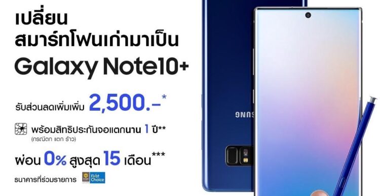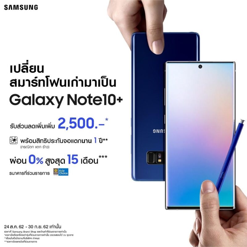 พิเศษ! ซัมซุงส่งโปรโมชั่นเก่าแลกใหม่ รับส่วนลดเพิ่มสูงสุด 2,500 บาท เมื่อนำโทรศัพท์มือถือเครื่องเก่ารุ่นใดยี่ห้อใดก็ได้ มาแลกซื้อ กาแลคซี่ โน้ต 10 พลัส ตั้งแต่วันที่ 24 สิงหาคม และ กาแลคซี่ โน้ต 10 ตั้งแต่วันที่1 กันยายนเป็นต้นไป ที่ซัมซุงแบรนด์ช็อปและร้านค้าที่ร่วมรายการ ถึงวันที่ 30 กันยายน 2562 เท่านั้น สามารถตรวจสอบรายละเอียดโปรโมชั่นเพิ่มเติมได้ที่จุดขาย หรือเว็ปไซต์ http://www.samsung.com/th/note10/specialoffer