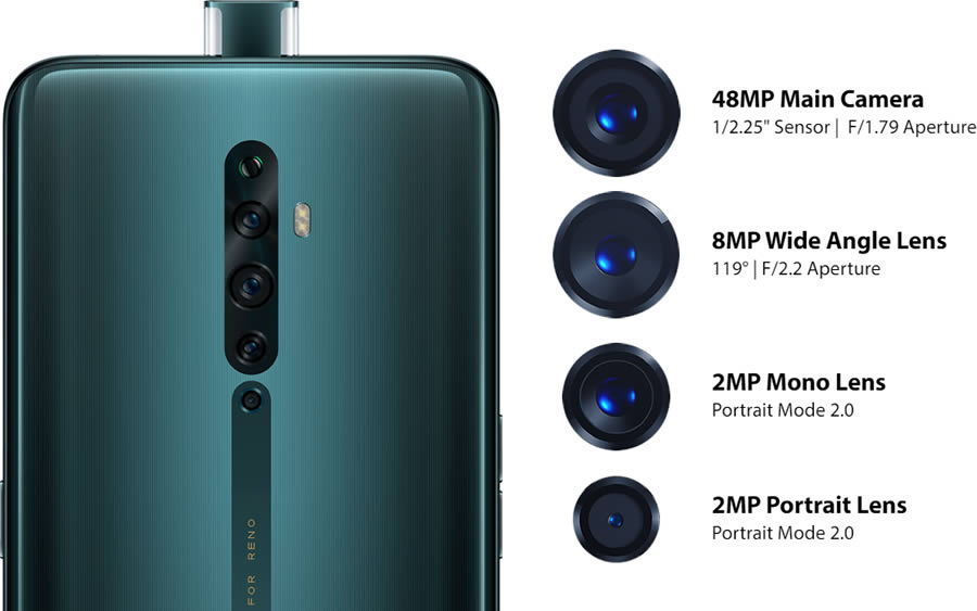 OPPO Reno2 มาพร้อมกล้องหลัก 48 ล้านพิกเซล ใช้เซ็นเซอร์ Sony IMX586 ขนาด 1/2.0 นิ้ว รูรับแสง F1.7 ระบบลดภาพสั่นไหว OIS วางคู่กับกล้องมุมกว้างพิเศษ 116 องศา ความละเอียด 8 ล้านพิกเซล มีกล้องเทเลโฟโต้ 13 ล้านพิกเซล รูรับแสง F2.4 และกล้องตัวที่ 4 มีความละเอียด 2 ล้านพิกเซล รองรับระบบซูมดิจิตอลสูงสุด 20 เท่า และซูมแบบไฮบริดสูงสุด 5 เท่า
