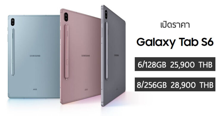 แท็บเล็ตระดับพรีเมี่ยม Samsung Galaxy Tab S6 พร้อมทำตลาดในประเทศไทยแล้ว โดยมีการประกาศราคาออกมาในวันนี้ เริ่มต้นที่ 25,900 บาท สำหรับรุ่น RAM 6GB จับคู่กับ ROM 128GB และราคา 28,900 บาท สำหรับรุ่น RAM 8GB จับคู่กับ ROM 256GB ทั้ง 2 รุ่น รองรับ 4G LTE และมาพร้อม S Pen รุ่นใหม่ที่ให้ประสบการณ์การใช้งานแบบเดียวกับ Galaxy Note 10 พรีเมี่ยมสมาร์ทโฟนรุ่นใหม่ล่าสุด