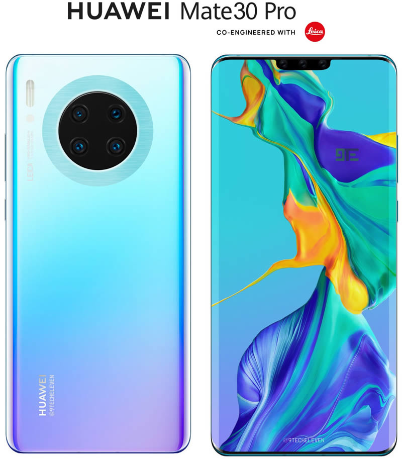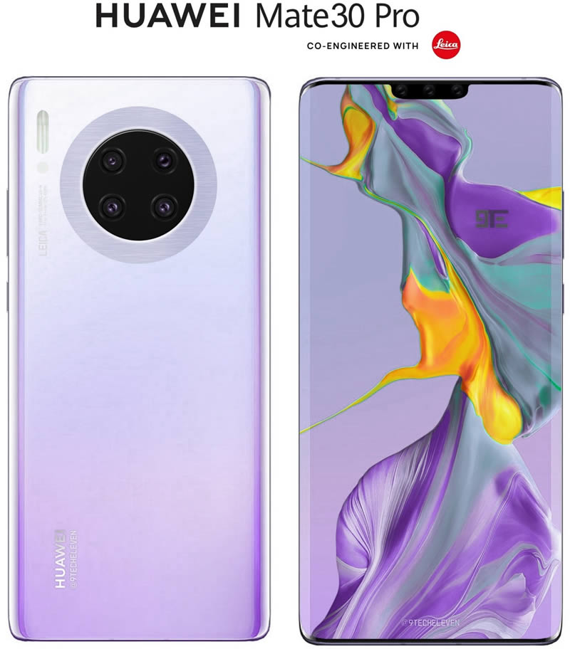 ด้านหน้าของ Mate 30 Pro ยังมีส่วนคล้ายกับรุ่น Mate 20 Pro โดยเฉพาะรอยบาก แต่มีข่าวลือว่าจอแสดงผลจะมีขอบด้านข้างที่โค้งถึง 90 องศา ทำให้มีอัตราส่วนหน้าจอต่อบอดี้เกือบ 100% ส่วนด้านหลังจะสะดุดตากับดีไซน์กล้องหลัง 4 ตัว ที่วางอยู่ในกรอบวงกลมขนาดใหญ่ โดยย้ายแฟลชแยกออกไปวางที่ด้านข้าง