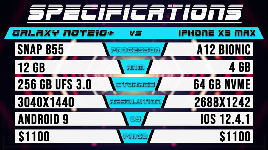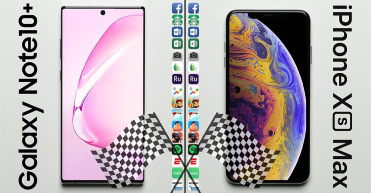 Samsung Galaxy Note 10+ ที่นำมาทดสอบในครั้งนี้ เป็นเวอร์ชั่นที่มาพร้อมชิปประมวลผลของ Qualcomm ความจำ RAM 12GB จับคู่กับ ROM 256GB แบบ UFS 3.0 และทำงานบนพื้นฐาน Android 9 อีกมุมหนึ่งคือ iPhone XS Max รุ่นความจุ 64GB ใช้ชิปประมวลผล A12 ความจำ RAM 4GB และทั้งคู่วางจำหน่ายในราคาเท่ากันในสหรัฐอเมริกา