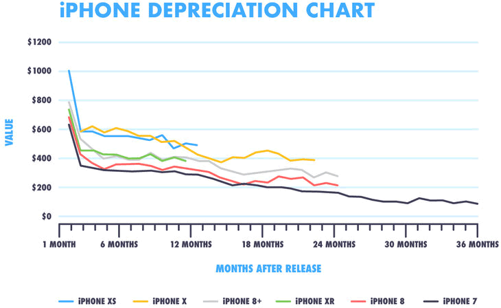 จากข้อมูลของ Decluttr พบว่า iPhone XS มีมูลค่าลดลงไป 49% หลังจากเปิดตัวมานาน 11 เดือน แต่โดยเฉลี่ยแล้ว iPhone จะมีมูลค่าลดลงไป 30% เมื่อ Apple เปิดตัวรุ่นใหม่