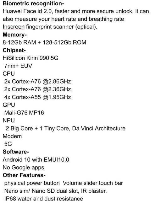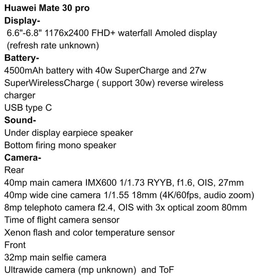 Huawei Mate 30 Pro จะได้รับชิป Kirin 990 5G สำหรับรุ่นสูงสุดจะมาพร้อม RAM 12GB จับคู่กับ ROM 512GB กล้องหลัง 4 ตัว 40 + 40 + 8 ล้านพิกเซล (กล้องตัวที่ 4 เป็นเซ็นเซอร์ ToF) ความจุแบตเตอรี่ 4500mAh และรองรับชาร์จเร็ว 40 วัตต์