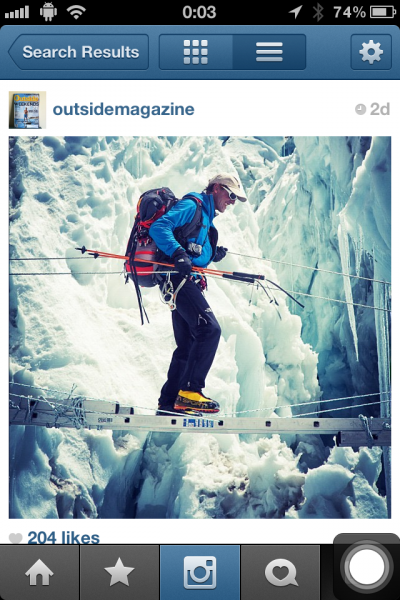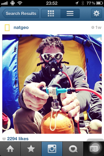 โดยนิตยสารชื่อดังได้โพสต์บทสนทนาถามตอบพูดคุยระหว่างนักไต่เขาเกี่ยวกับเทคนิคและฟิลเตอร์ที่ชื่นชอบ และมีการใช้ถุงมือพิเศษ ดังนั้นนิ้วมือของพวกเขาจึงไม่แข็ง โดยทีมนักไต่เขาได้แสดงการใช้ Instagram (ผ่านทางชื่อ @outsidemagazine on Everest) บนภูเขาเอเวอเรสต์เมื่อสองสัปดาห์ก่อน โดยเป็นการถ่ายภาพความพยายามในการช่วยเหลือทีมนักไต่เขา ซึ่งมีนักไต่เขาอย่างน้อย 4 ชีวิตที่จบชีวิตลงเมื่อสุดสัปดาห์ก่อน ซึ่งเพิ่มความกังวลใจเกี่ยวกับแรงกดดันที่ด้านบนยอดเขาเป็นอย่างมาก
