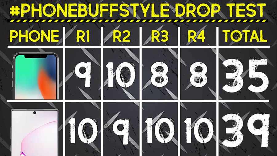 สรุปผลการทดสอบ Drop Test ของ PhoneBuff ได้ยกให้ Galaxy Note 10+ เป็นผู้ชนะจากคะแนนรวม 39 เต็ม 40 ส่วน iPhone 11 Pro Max ได้รับ 35 คะแนน