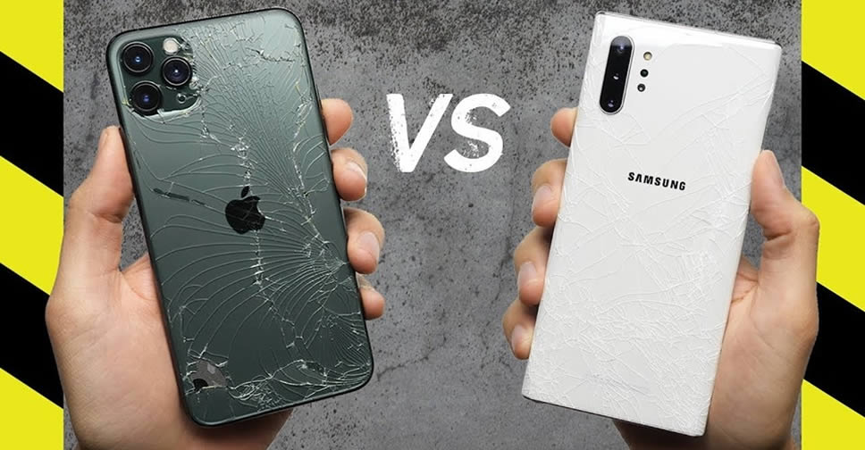การทดสอบครั้งแรก เป็นการปล่อยด้านหลังให้ตกลงมาสู่พื้นก่อน ที่ความสูงราว 1 เมตร โดยมีแผ่นคอนกรีตรองรับแรงกระแทก และผลที่ได้คือ แผงกระจกด้านหลังของ iPhone 11 Pro Max แตกร้าวมากกว่า Galaxy Note 10+ ถึงแม้ Apple จะบอกว่า “ใช้กระจกที่แข็งแกร่งที่สุดในบรรดาสมาร์ทโฟน ทั้งด้านหน้าและด้านหลัง”