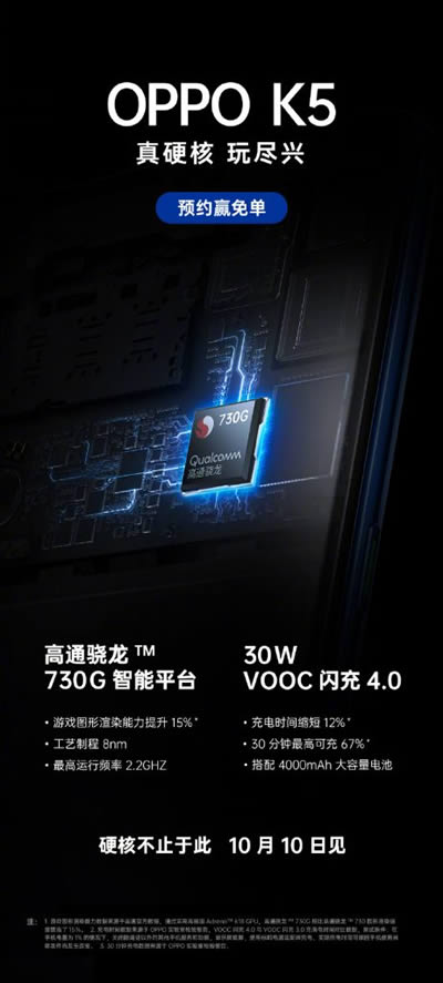 OPPO กำลังจะเปิดตัวสมาร์ทโฟนระดับเรือธง Reno Ace ในวันที่ 10 ตุลาคมนี้ และรูปภาพทีเซอร์ที่ถูกแชร์ออกมา ก็ยืนยันว่า OPPO K5 จะได้รับการเปิดตัวพร้อมกันด้วย โดยมาพร้อมชิปประมวลผล Qualcomm Snapdragon 730G และรองรับเทคโนโลยีชาร์จเร็ว 30W VOOC Flash Charge 4.0