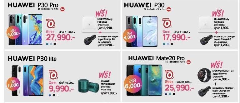 - HUAWEI P30 Pro รุ่นเรือธงยอดนิยม สุดยอดสมาร์ทโฟนที่ฉีกทุกกฏเกณฑ์ของการถ่ายภาพ ด้วยคุณสมบัติการถ่ายภาพชั้นเลิศจากกล้อง Leica Quad camera system ในราคา 27,990 และ HUAWEI P30 มาพร้อม Leica Triple camera สามารถเติมเต็มทุกๆ จินตนาการด้านการถ่ายภาพในราคา 17,990 บาท รับของสมนาคุณสุดคุ้ม HUAWEI body Fat Scale เครื่องชั่งน้ำหนักอัจฉริยะวัดได้ทั้งน้ำหนักและมวลไขมัน มูลค่า 1,990 และHUAWEI SuperChargeTM Car Charger มูลค่า 1,290 บาท