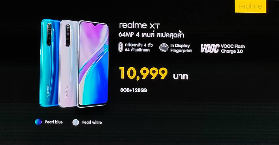 realme เปิดตัวสมาร์ทโฟนเรือธงของแบรนด์ realme XT ในประเทศไทยแล้ววันนี้!! โดยมีจุดเด่นที่ระบบกล้องหลัง 4 ตัว 64MP AI Quad Camera มาพร้อมจอแสดงผล Super AMOLED ขนาด 6.4 นิ้ว ใช้ชิปประมวลผล Qualcomm Snapdragon 712 แรม 8GB และรองรับเทคโนโลยีชาร์จเร็ว VOOC Flash Charge 3.0