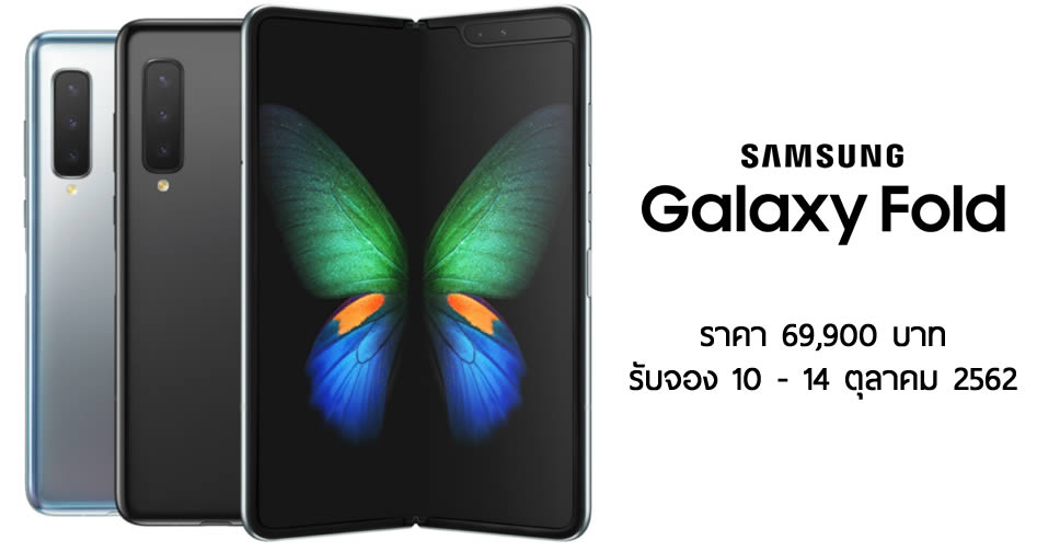 Samsung Galaxy Fold เตรียมเปิดให้ผู้ที่สนใจสั่งซื้อล่วงหน้าในระหว่างวันที่ 10 – 14 ตุลาคม 2562 ผ่านผู้ให้บริการฯ รายใหญ่ AIS, Dtac และ TrueMove H รวมถึง Samsung Experience Store โดยมีจำนวนจำกัดเท่านั้น