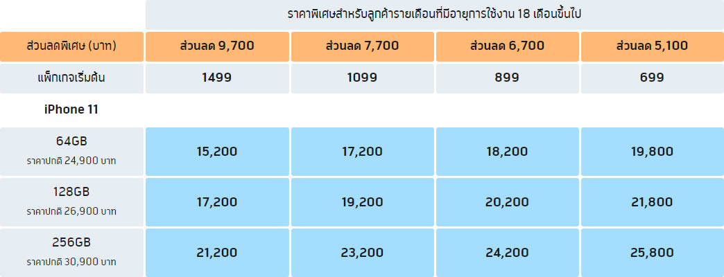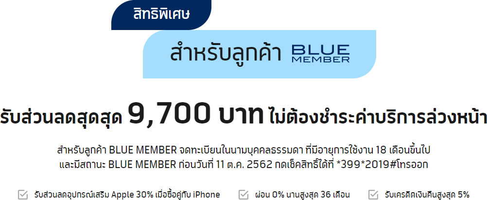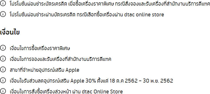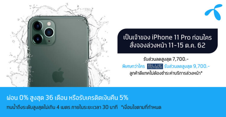 Dtac เปิดรับจอง iPhone 11, iPhone 11 Pro และ iPhone 11 Pro Max อย่างทางการแล้ว ตั้งแต่วันนี้ ไปจนถึงวันที่ 15 ตุลาคม 2562 เวลา 12.00 น. พร้อมมอบส่วนลดสูงสุด 9,700 บาท สำหรับลูกค้า BLUE MEMBER และส่วนลดสูงสุด 7,700 บาท สำหรับลูกค้าเปิดเบอร์ใหม่ / ย้ายค่ายเบอร์เดิม / เปลี่ยนจากเติมเงินเป็นรายเดือน / ลูกค้าปัจจุบันในระบบรายเดือน และพิเศษ!! สำหรับลูกค้า Dtac ที่มีอายุการใช้งาน 18 เดือนขึ้นไป ไม่ต้องชำระค่าบริการล่วงหน้า และยังสามารถผ่อน 0% นานสูงสุด 36 เดือน กับธนาคารที่ร่วมรายการ
