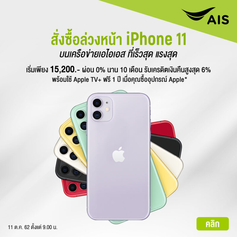 โดยสามารถเป็นเจ้าของ iPhone 11 ได้ในราคาเริ่มต้นเพียง 15,200 บาท และ iPhone 11 Pro เริ่มต้นเพียง 26,200 บาท และ iPhone 11 Pro Max เริ่มต้นเพียง 30,200 บาทเท่านั้น สรุปแล้วเรียกได้ว่าเมื่อได้เห็นเหตุผลโดนใจว่าทำไมถึงต้องซื้อ iPhone 11 กับทาง AIS กันไปแล้ว บอกได้เลยว่าใครที่กำลังลังเลอยากเป็นเจ้าของ iPhone 11 แต่ยังไม่รู้ว่าจะซื้อกับเจ้าไหนดี ต้องรีบมาสั่งจอง สั่งซื้อกับทาง AIS กันแบบด่วนๆ กันแล้ว