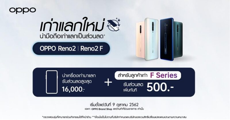 OPPO จัดแคมเปญ สุดพิเศษ เก่าแลกใหม่ เอาใจผู้ใช้ เพียงนำสมาร์ทโฟน OPPO F Series มาแลกรับส่วนลดในการซื้อ OPPO Reno2 F และ OPPO Reno2 โดยผู้ใช้ OPPO F Series จะได้รับส่วนลดถึงสองส่วน จากราคาประเมินสมาร์ทโฟนเครื่องเก่า
