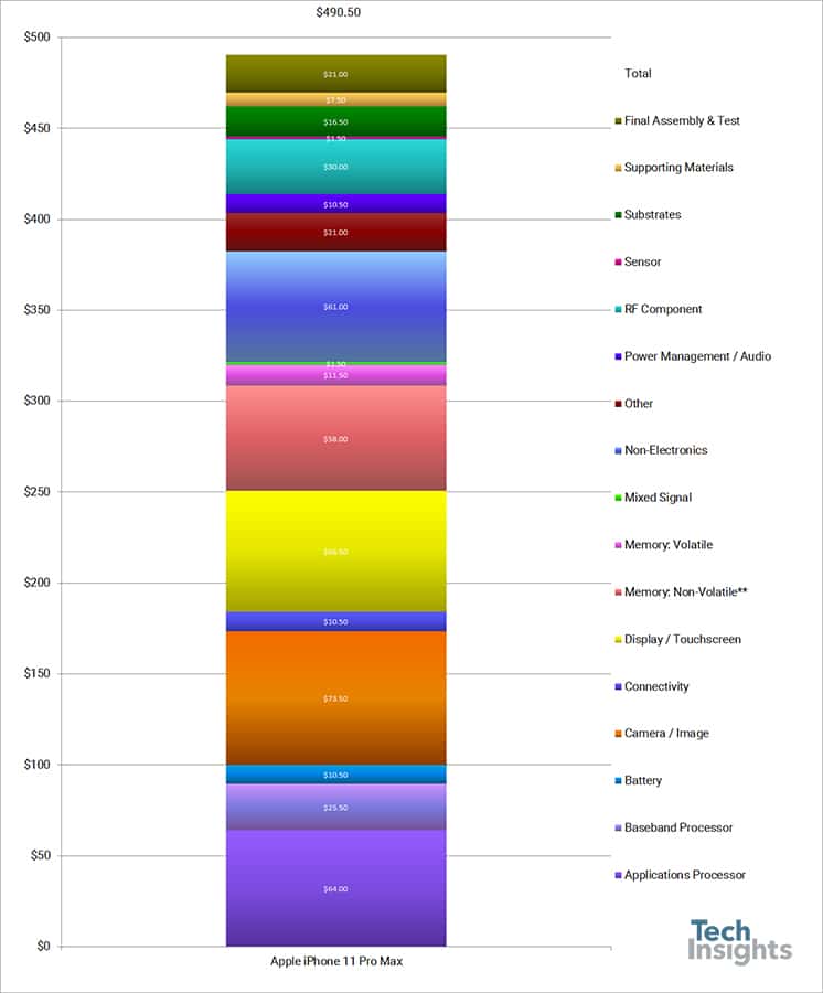 TechInsights ได้ชำแหละ iPhone 11 Pro Max เพื่อตรวจสอบราคาฮาร์ดแวร์ของ iPhone ที่ดีที่สุดของ Apple และพบว่าชิ้นส่วนทั้งหมดของ iPhone 11 Pro Max มีมูลค่ารวม 490.50 ดอลล่าร์สหรัฐ หรือราว 14,916 บาท ขณะที่ราคาขายปลีกเริ่มต้นที่ 1,099 ดอลล่าร์สหรัฐ หรือราว 33,444 บาท